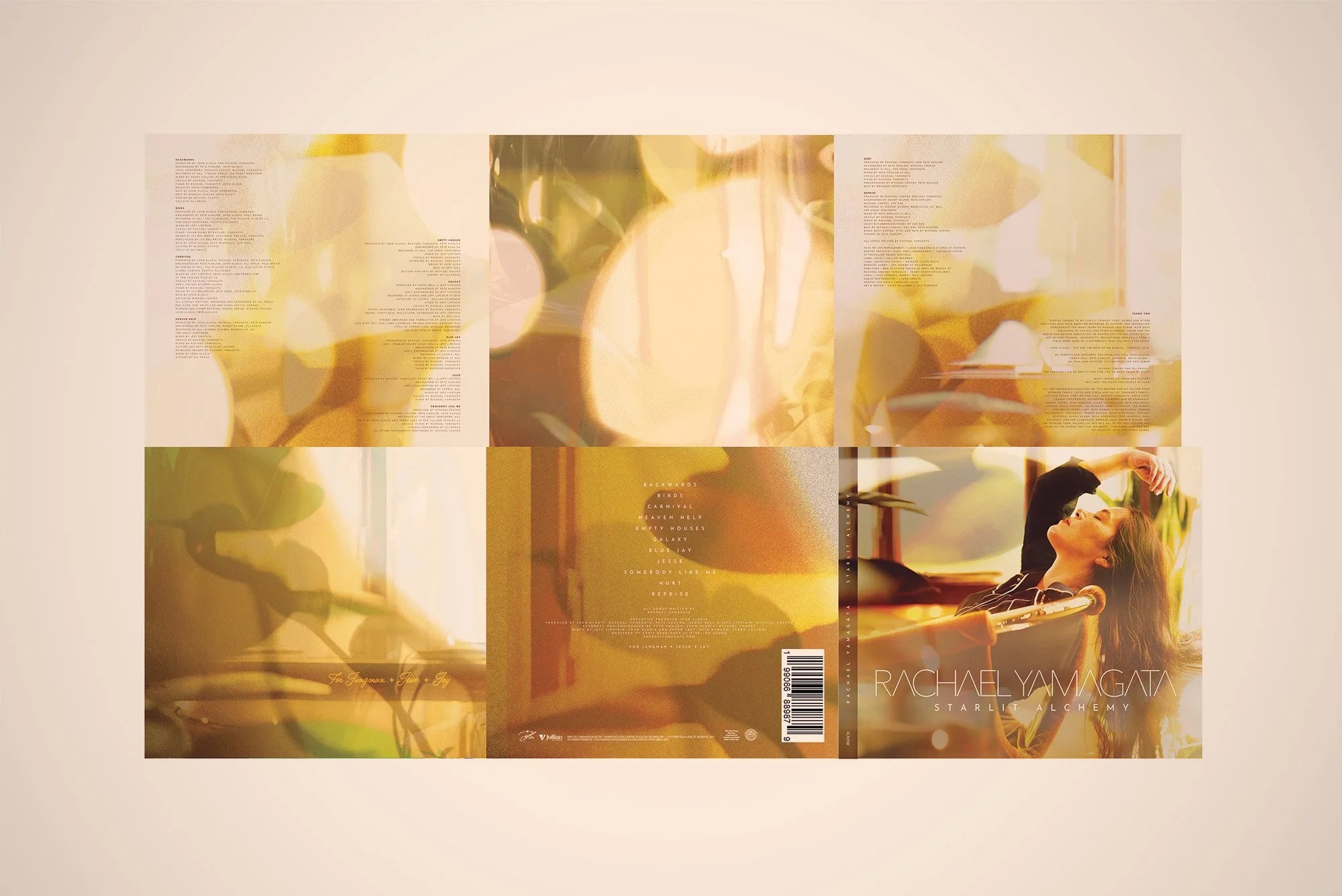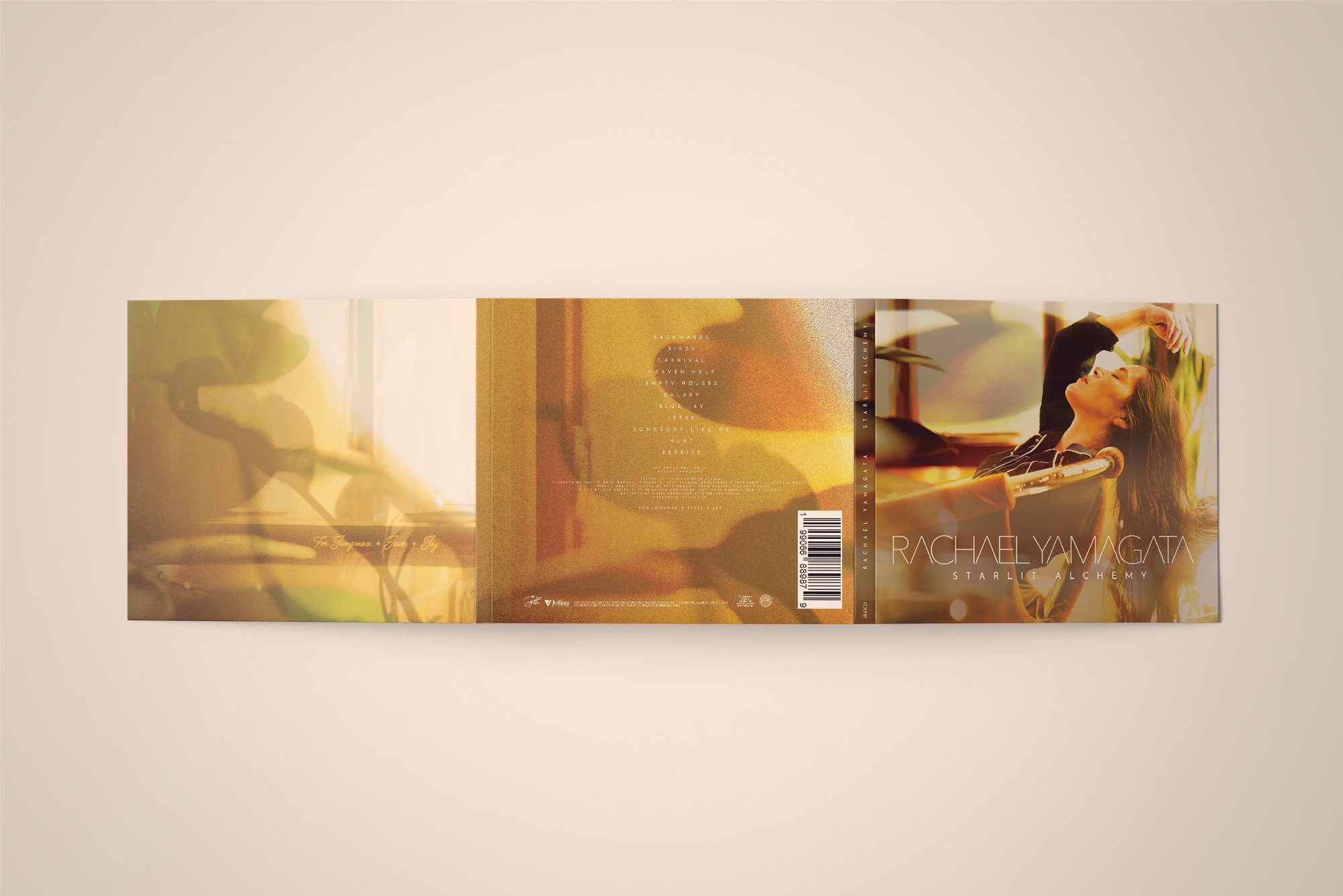 Rachael Yamagata is a singer songwriter and pianist whose team requested an adaptation of the artwork for her latest album Starlit Alchemy into a Digipak CD release. Building on the vinyl design by Casey Williams, the project involved reworking the existing panels (front cover, back cover, and lyrics) and creating several new elements, including additional interior panels and the disc label, to complete the CD layout. The final package stays true to the original aesthetic while giving the CD edition its own distinct finished feel.